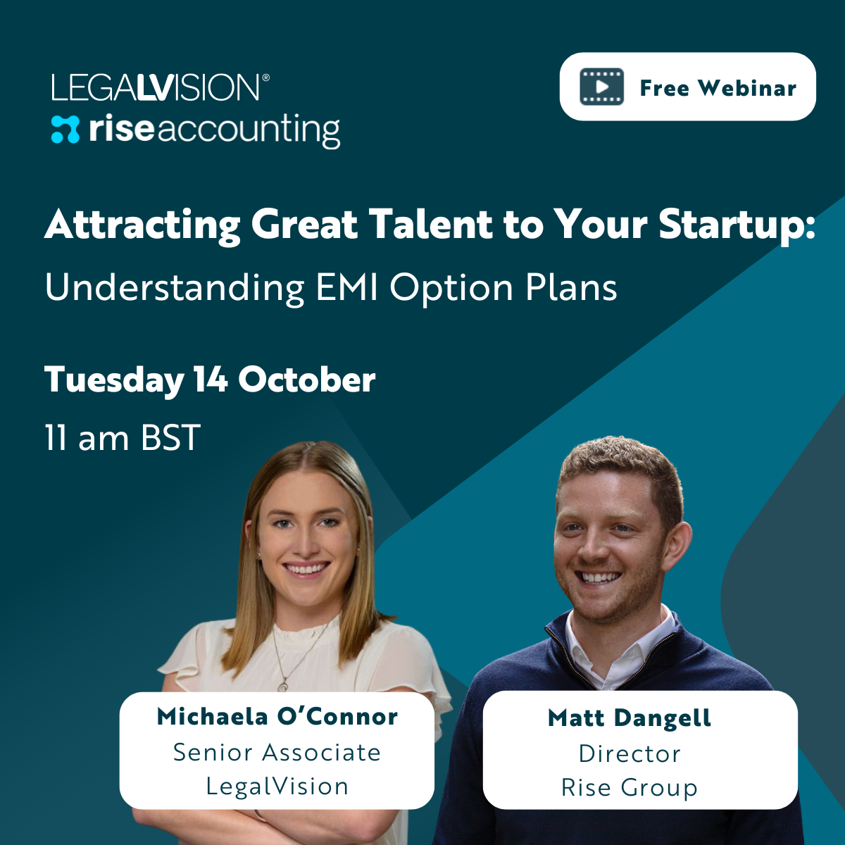 LegalVision is hosting a free webinar, Attracting Great Talent to Your Startup: Understanding EMI Option Plans, with Michaela O’Connor (Senior Associate) and Rise Group’s Matt Dangell.